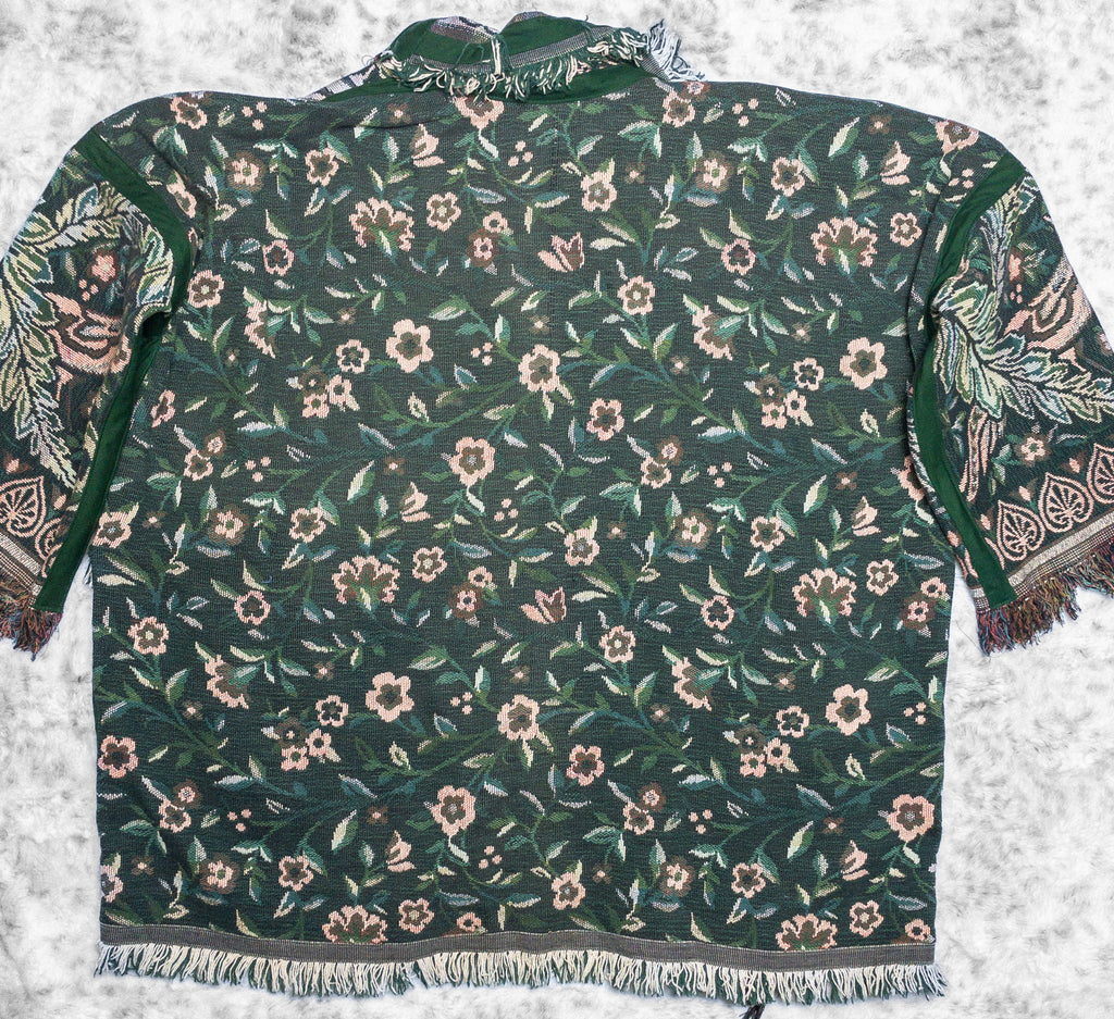 This one-of-a-kind cozy coat was created using reclaimed textiles, every bit possible. Some reverse sides are prettier than others, but all seams are bound so that this coat is reversible! Each coat is priced to account for the cost of the textile plus the design and sewing labor.