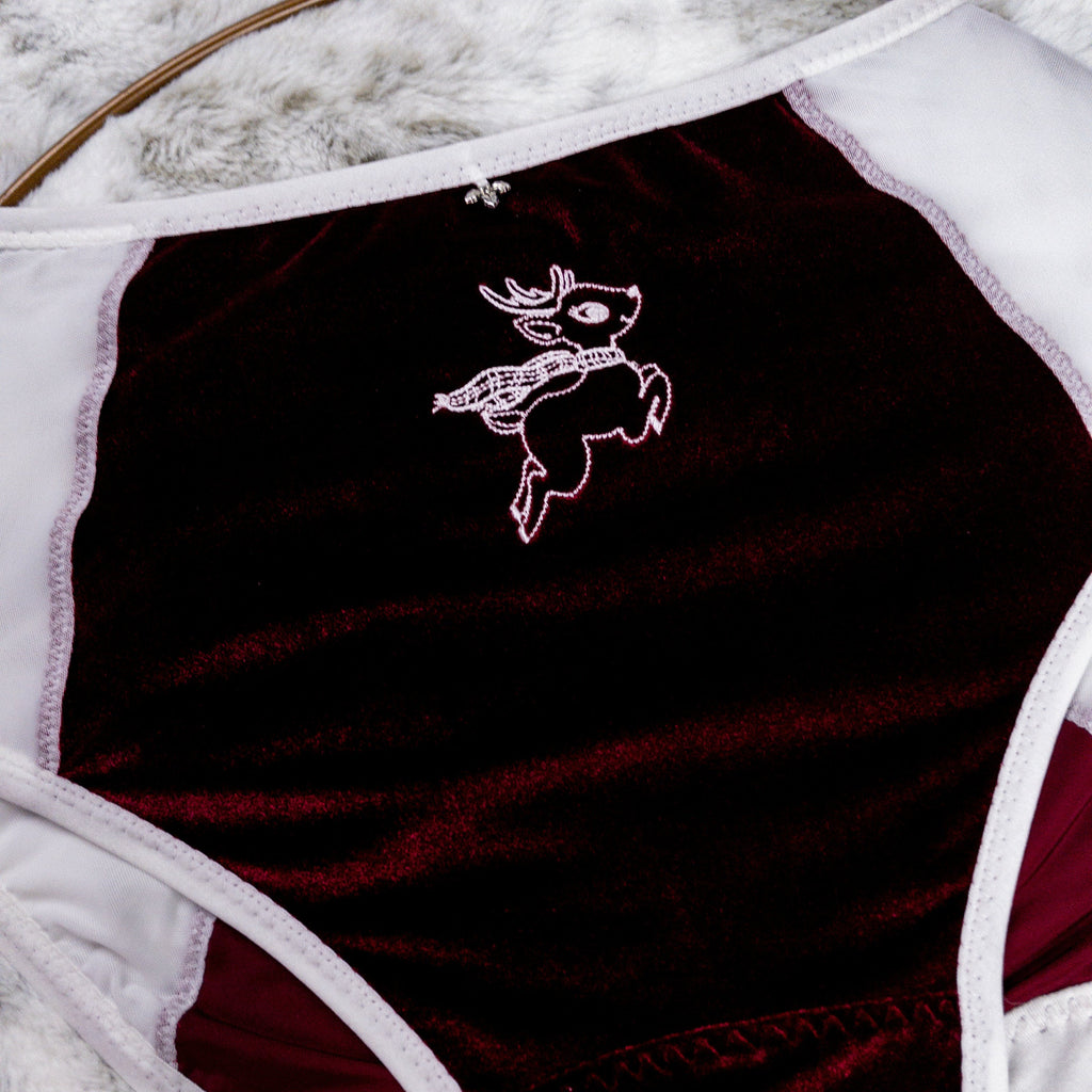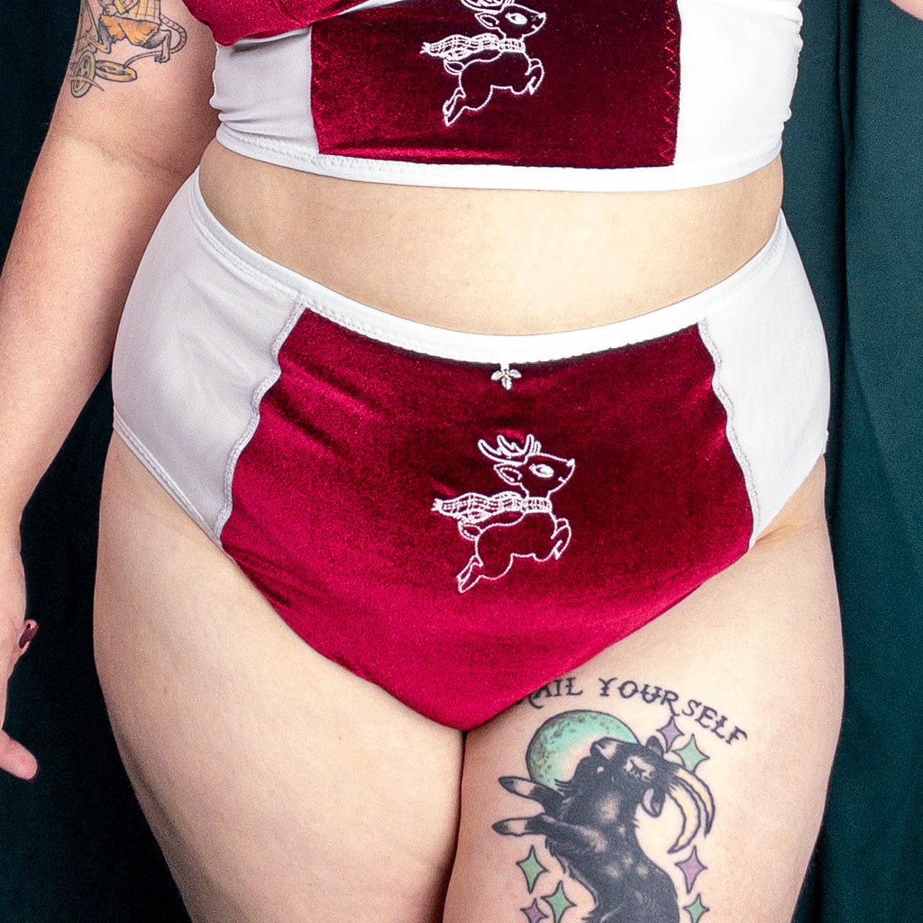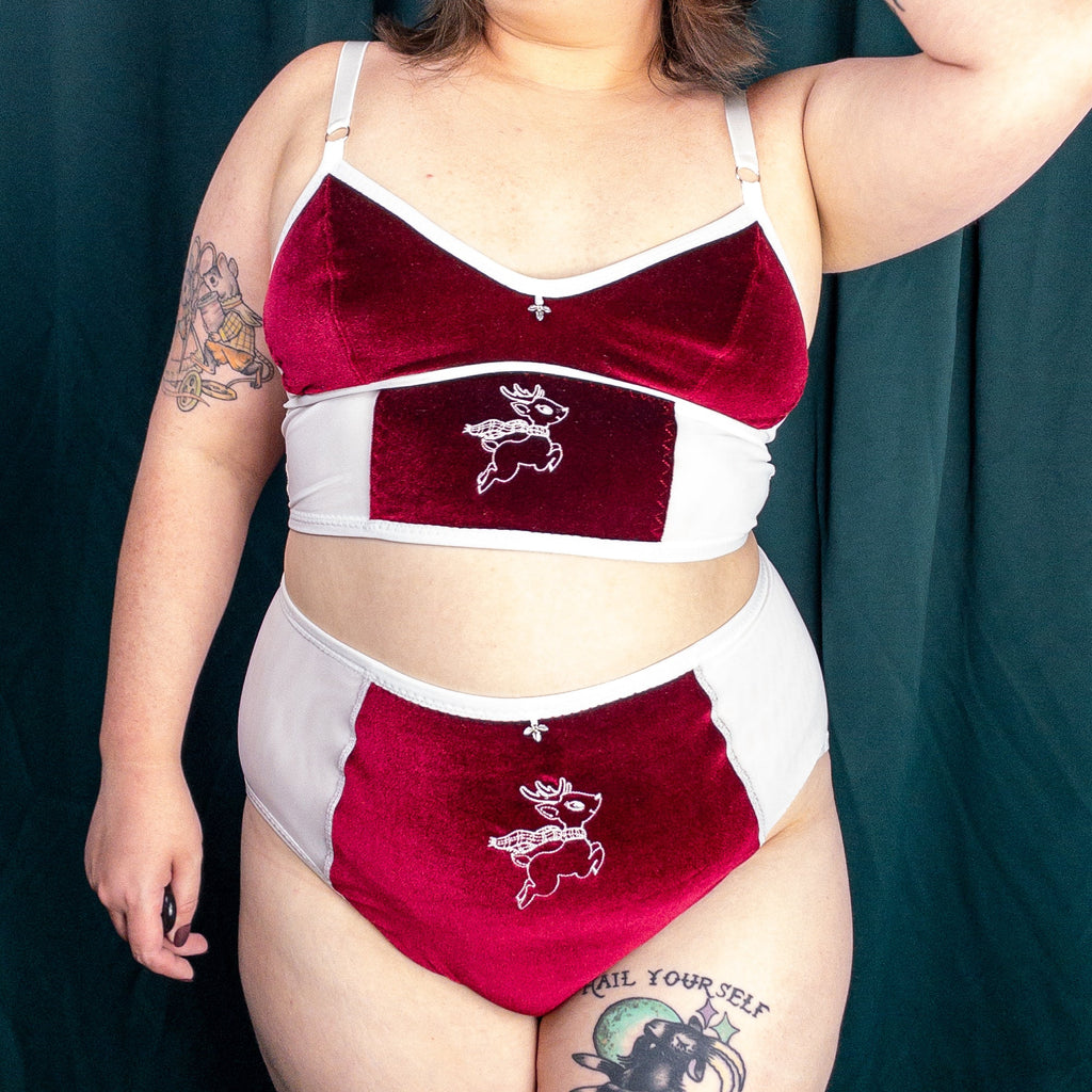 A velvet brief with strong but soft power mesh panels and decorated with gorgeous embroidery. These undies have comfy foldover elastic on the legs and waist, and are finished with a cute christmasy holly charm (for a lil EXTRA charm). Stay loungy lush and naughty/nice this season with a little help from this luxe (but comfy) set.
